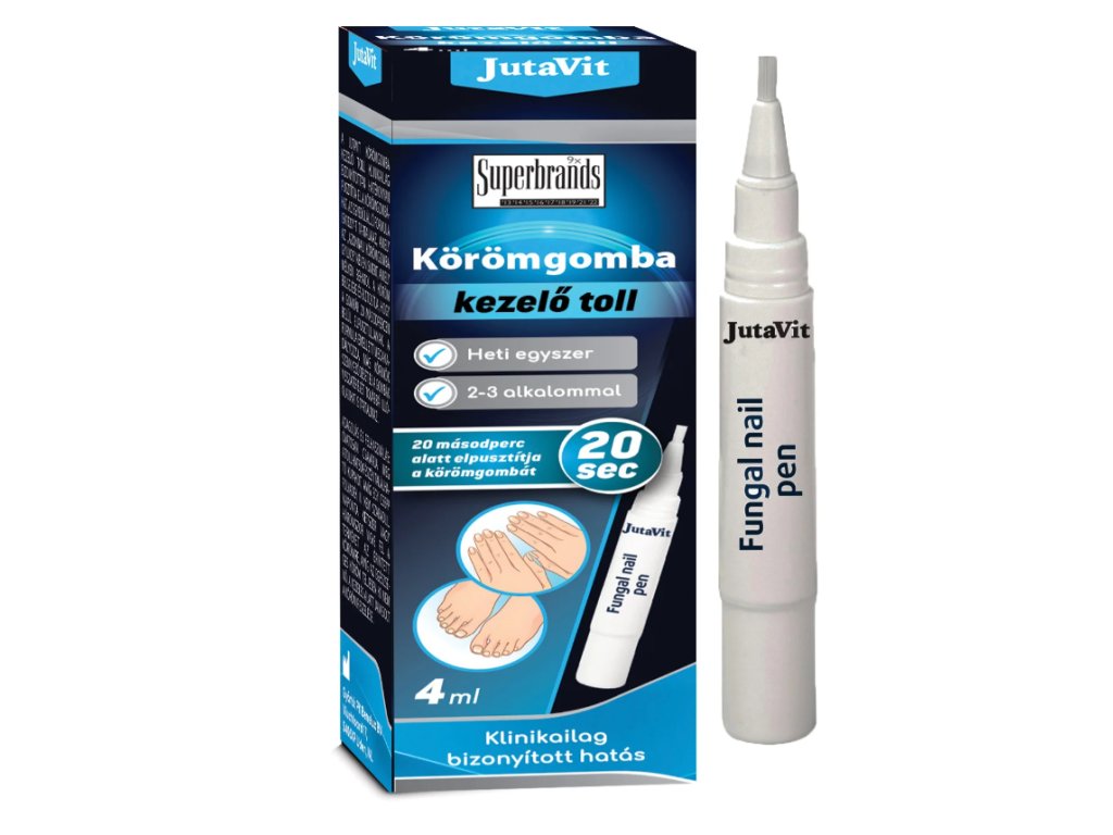 amely segít a gombás köröm (onychomycosis) kezelésében. A JutaVit körömgomba kezelő toll hatékonynak bizonyult a körömgombásodást okozó penészgombák kezelésében. Az ISK1320®, egyedülálló formula olyan összetevőket tartalmaz, amelyek behatolnak a köröm felszínébe, és 20 másodpercen belül elpusztítják a gombákat. A folyadék réteget képez a körmön, így a gombák szaporodásának kedvezőtlen környezetet hoz létre, és fizikai gátként akadályozza meg a penészgombák terjedését. A gyorsabb, jobb eredmény elérése érdekében a gombás köröm hetente egyszeri gondos reszelése javasolt. Ha a kezelést leállítják, a gombás köröm gyorsabban visszatér. Ezért fontos, hogy folytassa a JutaVit körömgomba kezelő toll használatát, amíg a gombás fertőzés el nem múlik a körmön. Mivel a nedves környezet a gombás körömfertőzések egyik oka, erősen ajánlott, hogy csak nedvszívó anyagból, például pamutból vagy gyapjúból készült zoknit viseljen. Ez fontos, mivel a penészgombák általában nedves környezetben fordulnak elő, ahol elszaporodhatnak. Ha gombás fertőzést észlel a köröm felületén, fontos, hogy szárazon tartsa a lábát.